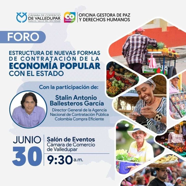 El director general de la Agencia Nacional Colombia Compra Eficiente estará en Valledupar convocado por la Cámara de Comercio de Valledupar para liderar un foro con representantes de la Mypimes en el que se explicarán las nuevas formas que puede tener la economía popular para contratación con el Estado. el objetivo principal de este foro es que funcionarios del alto gobierno como Stalin Ballesteros de Colombia Compra Eficiente y Javier Martínez Cabello, Coordinador Regional Caribe de la Unidad Administrativa de Organizaciones Solidarias, expliquen a los asistentes los alcances del Decreto 142 del 2023 relacionado con la contratación de las Mypimes y proveedores de la economía popular con el Estado.