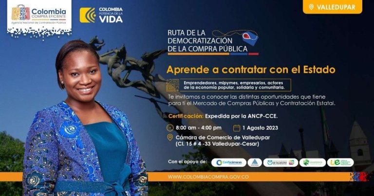 Este 01 de agosto de 2023 a partir de las 8:00 a.m., la Cámara de Comercio de Valledupar para el Valle del Río Cesar en compañía de la Agencia Nacional de Contratación Publica ‘Colombia Compra Eficiente’, la Escuela Superior de Administración Pública-ESAP, la Universidad Popular del Cesar y Confecámaras, capacitarán con expertos nacionales a microempresarios, emprendedores, Mypimes y actores de la Economía Popular, solidaria y comunitaria sobre cómo ser proveedores del Estado.