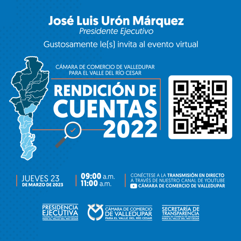 14 de marzo de 2023. Este 23 de marzo en el salón Yui del Hotel Sicarare de Valledupar a partir de las 9:00 a.m. con la presencia de representantes delegados del Gobierno Nacional, empresarios y comerciantes, la Cámara de Comercio de Valledupar para el Valle del Río Cesar realizará la Rendición de Cuentas vigencia 2022. Este evento se transmitirá en vivo a través del canal de YouTube institucional: Cámara de Comercio de Valledupar.